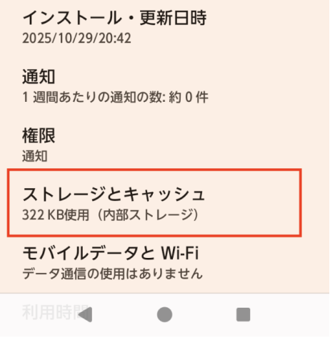 2. 設定→アプリ→リコーそだちえ→ストレージとキャッシュ→どちらも削除